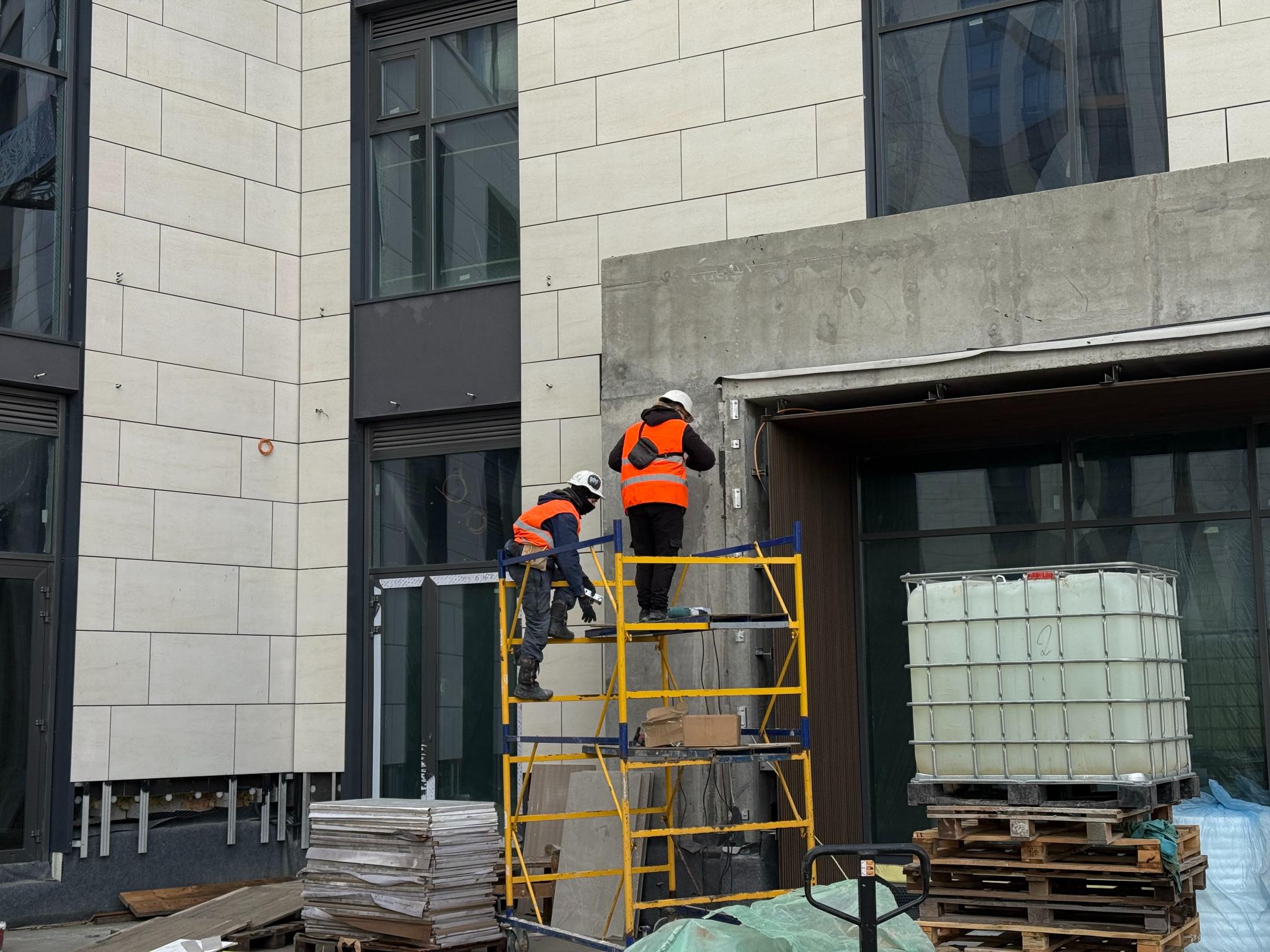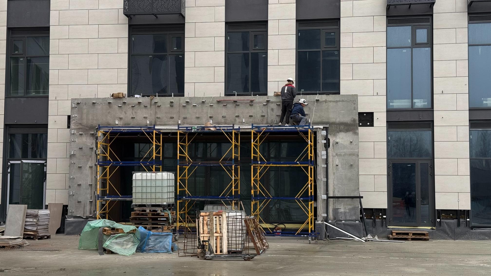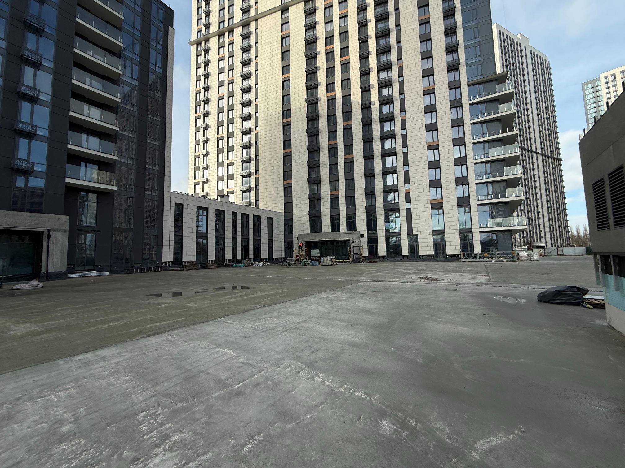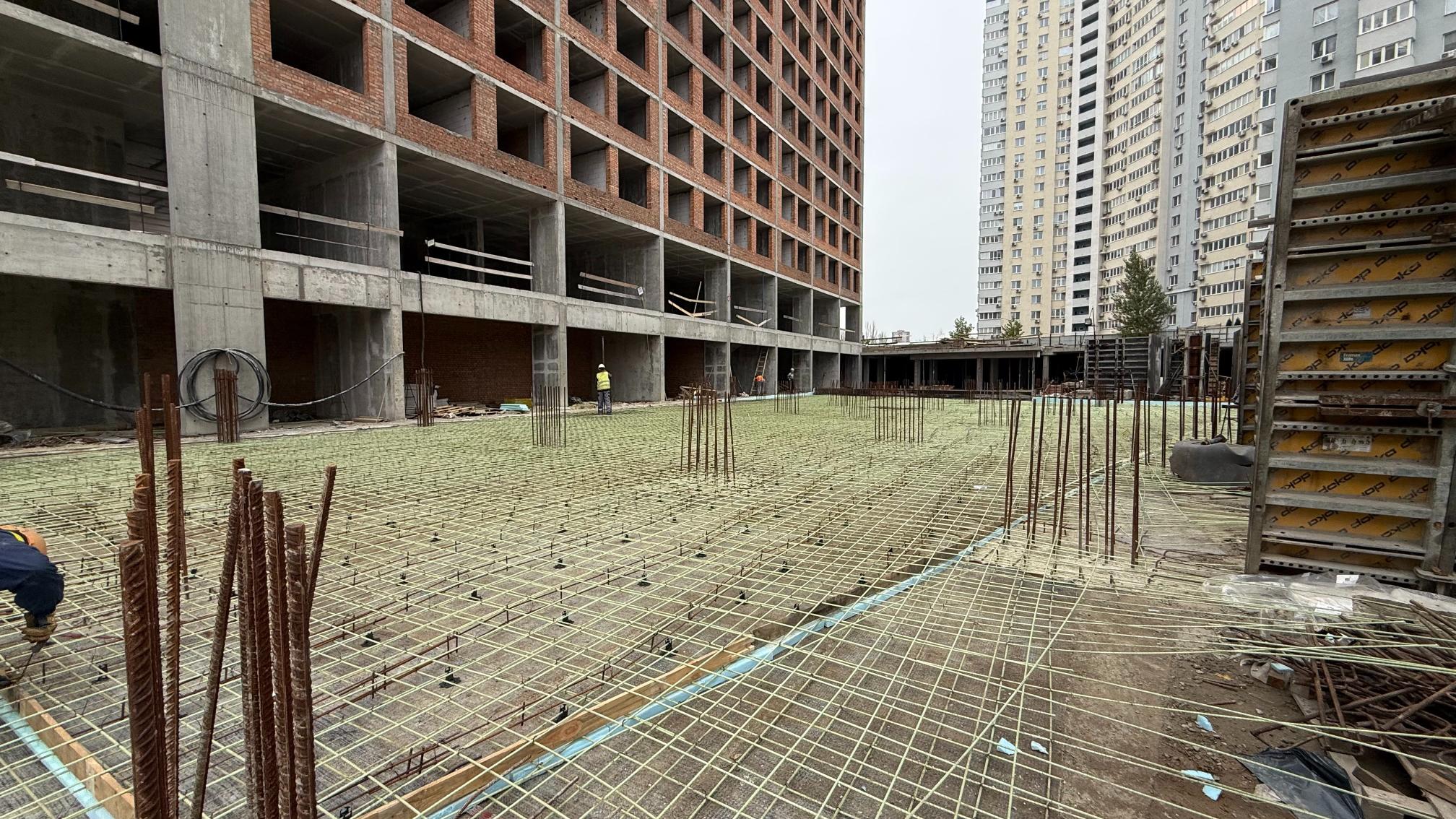 • продовжуються роботи з улаштування підлог паркінгу (шліфування дифузійних швів, гідроізоляція та укладання підлог з фібробетону) – 15%.